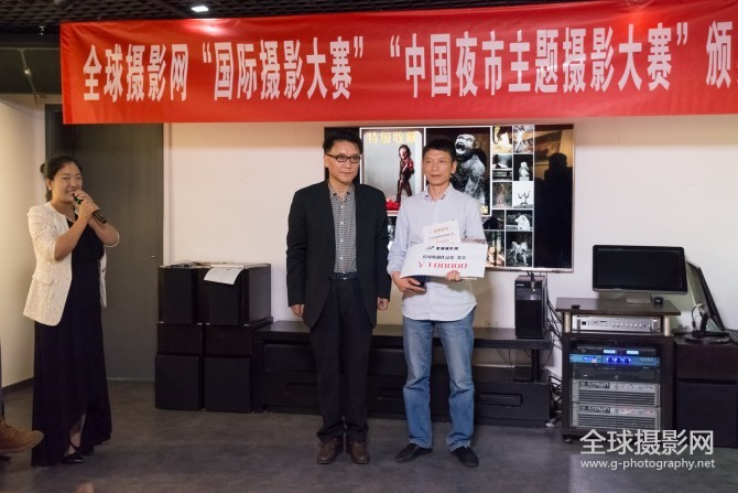 所有获奖者和在场嘉宾以及全球摄影网总裁刘福生合影 李晨阳 摄影 总编苏民安代表全球摄影网向所有到场嘉宾致辞:全球摄影网每年都会举办多项赛事,得到了世界摄影界的广泛关注,参与者众多。在场的获奖嘉宾中,有摄影爱好者,有摄影系学生,还不乏专业摄影师和知名摄影家。此次颁奖典礼涉及的两项赛事,均由国内著名的摄影家、学者担任评委,他们本着网站公平、公正、公开的原则,评选出了诸多优秀的作品,并给予了作品很高的评价。希望大家能够继续关注全球摄影网的活动,以摄影的方式展示自己,也祝福大家在今后的摄影活动中取得更骄人的成绩,在摄影的道路上获得更多的快乐。 颁奖礼上首先颁发了全球摄影网首届“中国夜市”主题摄影大赛的金、银、铜奖。该赛事共评选出26幅/组获奖作品,其金奖由呼伦贝尔学院摄影系教授白云翔摘得,他的组照作品《呼伦贝尔草原夜市》以纪实影像描绘了牧人们的夜生活状态,展现了蒙古族的敖包文化。铜奖获得者张晋也上台领取了奖项。银奖获得者李玲、魏永广,铜奖获得者曾庆国、安德鲁·米齐虽未能来到现场,但是他们都以VCR的形式表达了获奖心情。