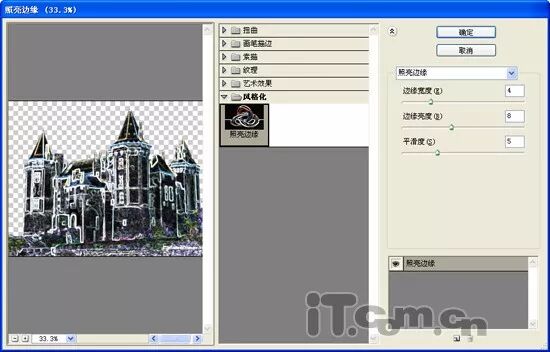 4、在菜单栏中选择[滤镜]/[风格化]/[照亮边缘]选项,打开“照亮边缘”对话框设置“边缘宽度”为4,“边缘亮度”为8,“平滑度”为5