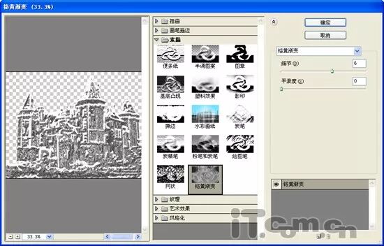 7、在菜单栏中选择[滤镜]/[素描]/[铬黄渐变]选项,按开“铬黄渐变”对话框,然后设置“细节”为6,“平滑度”为0