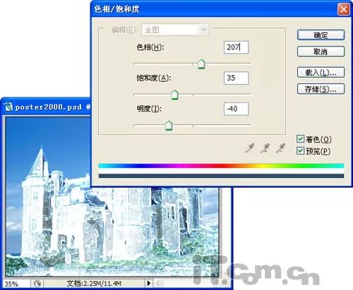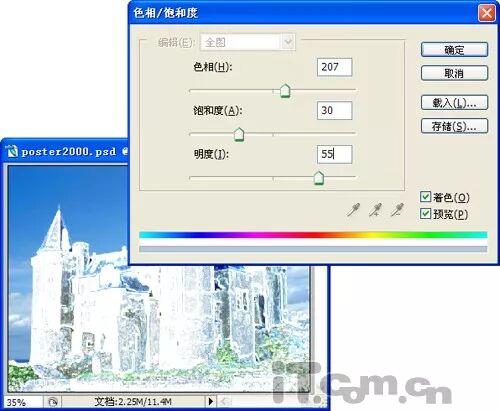 9、选择“图层1副本2”,在菜单栏中选择[图像]/[调整]/[色相/饱和度]选项,打开“色相/饱和度”对话框,然后选择“着色”复选栏,并设置“色相”为207,“饱和度”为30,“明度”为55