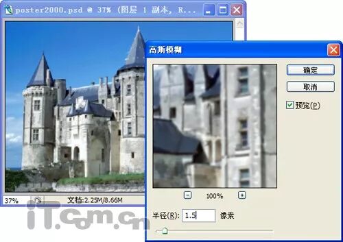 3、单击“图层1副本”然后在菜单栏选择[滤镜]/[模糊]/[高斯模糊]选项,打开“高斯模糊”对话框,设置半径为“1.5”像素