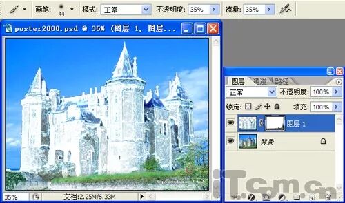 14、开启“背景”图层的可见性,选择“图层1”并单击“添加图层蒙版”按钮,接着选择“画笔工具”,在蒙版层中涂抹图片中的“草地”和“树木”,如图14所示。