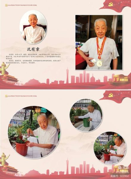 国际摄影协会广东羊城分会从活动启动4月开始,采访拍摄了14位90~103岁老人,他们中有军人、有志愿军战士、有南下干部、有老师、有普通的工人、农民,其中有6位在今年“七一"荣获光荣在党50年勋章。为了留下他们可爱的瞬间,我们把拍摄的影像和他们的个人介绍制作了影册,送给老人们留念。 7月底,羊城分会会员们冒着30多度酷暑,在八一建军94周年日前夕,把制作精美的相册送到了每一位老人手里,当看到寿星们拿着相册欣喜的表情,大家觉得所有的付出都是值得的。能近距离接触寿星们,听他们的故事,学习他们的乐观开朗,沾沾他们的福气,是我们的荣幸!大家都祝福寿星们身体健康!吉祥如意!福寿康宁! 让我们一起来感受一下寿星们的风釆吧! 103岁孔祥淼是孔子第75代后人,从小在山东曲阜的孔府生活长大,在孔子文化的熏陶下,从骨子里就带着孔子的儒家传统美德。 100岁林运山从1951~1956年在朝鲜当了五年志愿军。 100岁罗定球也是一名老军人,曾参加过多次与日军的激战。 99岁马守彝做了一辈子中学老师,教书育人,桃李满天下。 98岁冯德芳曾是一名出色的裁缝,擅长制作西装、旗袍。爱好看书写字,现每天仍坚持练习写毛笔字。 94岁麦妙芳喜欢跳广场舞,一直跳到88岁才停止,现五代同堂,其乐融融。 93岁况有章1952年由中央调干南下广东,为广东的建设发展作出贡献。 93岁尹明彬由基层做到高干,加入中国共产党已有68年。 92岁李杨达与妻子同甘共苦几十年,他们的事迹多次被媒体宣传报道,被广州市荔湾区评为“金婚好夫妻"。 92岁翟学友是一名南下干部,经常参加羽毛球比赛到80多岁。 90岁唐力山是一名优秀的解放军连长,多次出席广州军区积极分子代表大会。 90岁罗明见曾经是一名游击队员,也是一名文艺兵。 90岁黄庭焕也是一名抗美援朝志愿军。