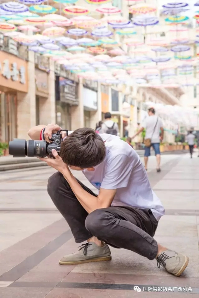 IPA郭秘书长,带领一支由广西分会成员和影友们组成的小组,在盛天地街区进行拍摄,影友们纷纷拿起自己的单反相机,有的长枪短炮,有或坐或卧,场面和谐而有趣。